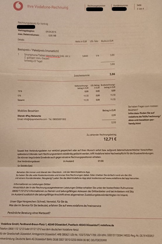 With this being said, and if you look into what I am being billed (in the description of which value billed) it says that for each of my numbers, mobile phone and tablet, that I am being billed for the respective Insurance or in German Versicherung, which goes against the statement "Die Vodafone Smartphone- und Tablet-Versicherung gilt nicht für CallYa...", therefore I believe that it is a mistake and that I should not being billed for these values.