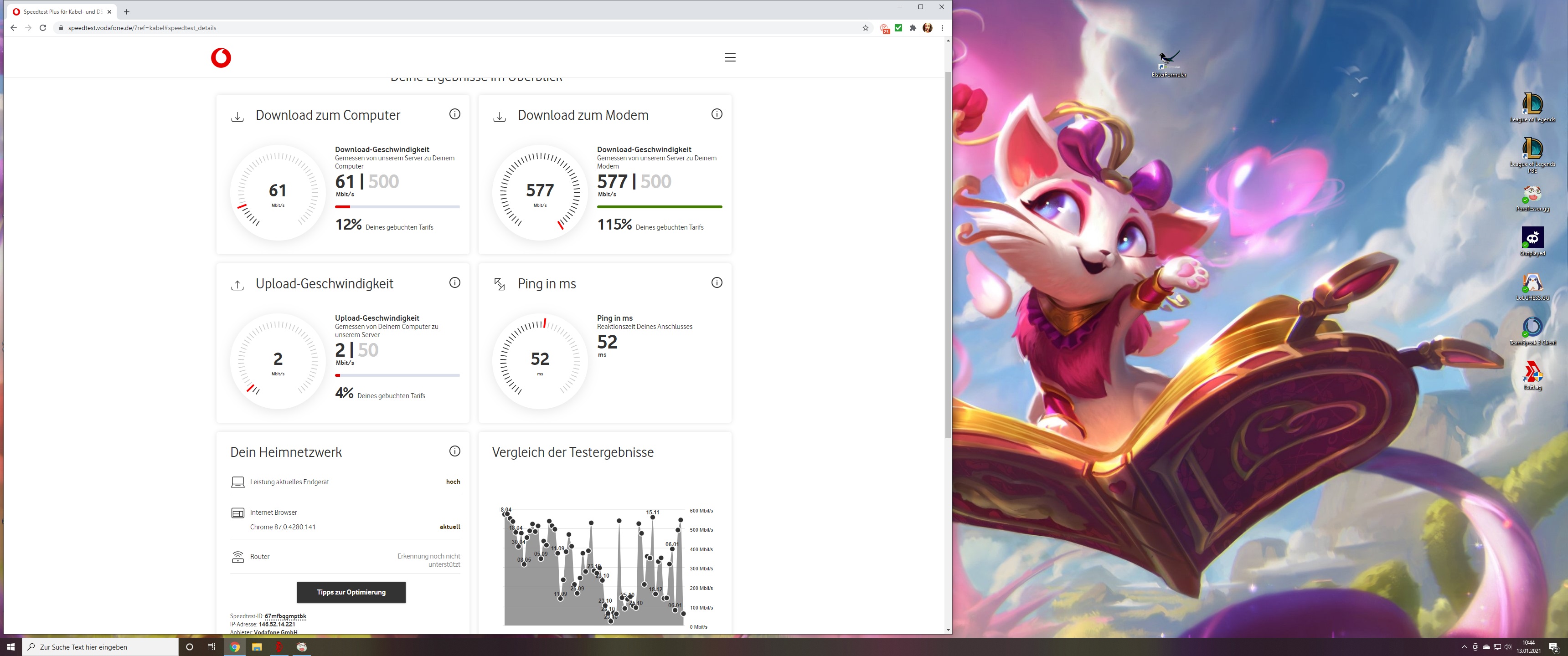 mein Freund arbeitet zur Zeit im Home Office und ist auf gutes Internet angewiesen... anbei ein Foto vom Speedtest... ich glaub langsam, dass mich der Test veräppeln will. Das Modem (Router) ist brand neu und mein Rechner kein halbes Jahr alt. Aber laut Speedtest liegt der Fehler ja bei mir.,.. ich platz so langsam und kann die Ausreden am Telefon von den Mitarbeitern (die auch nichts dafür können... das weiß ich) nicht mehr hören.