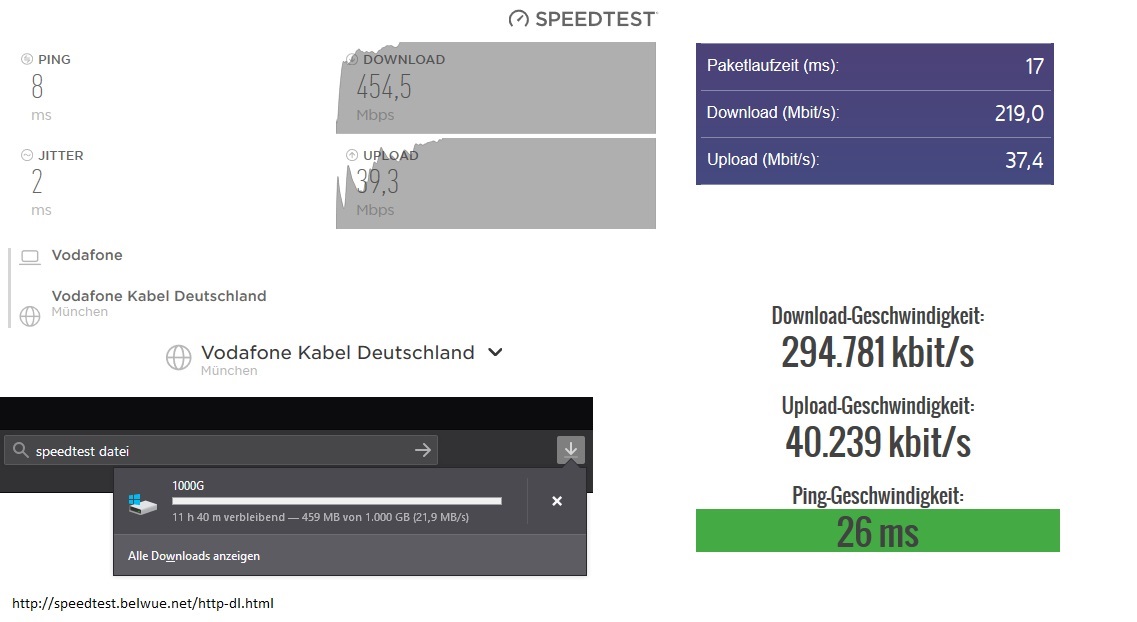 Verschiedene Test wurden auf verschiedenen Speedtestseiten durchgeführt inclusive Dateidownload.