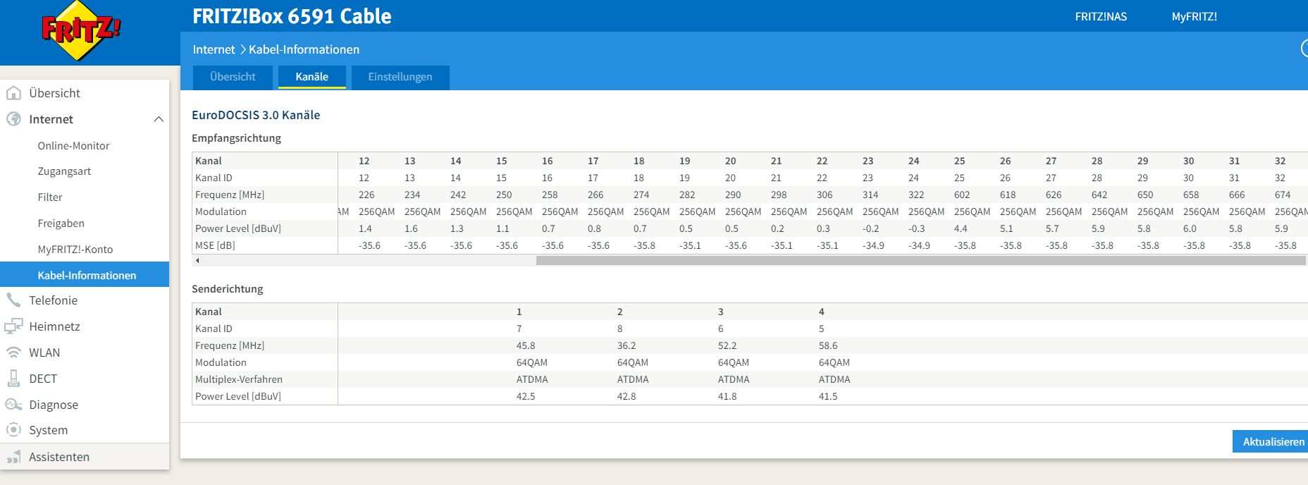 Internet anklicken > Kabelinformationen > Kanäle: Sende und Empfangsrichtung diese Werte.