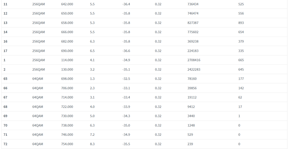 Jetzt laufen auch 2 US-Kanäle nur auf 16QAM, was auf einen Rückwegstörer hindeuten könnte. Beobachte das mal, ob sich da die Werte verändern, vielleicht noch weiter heruntergehen, 8 oder 4 QAM.