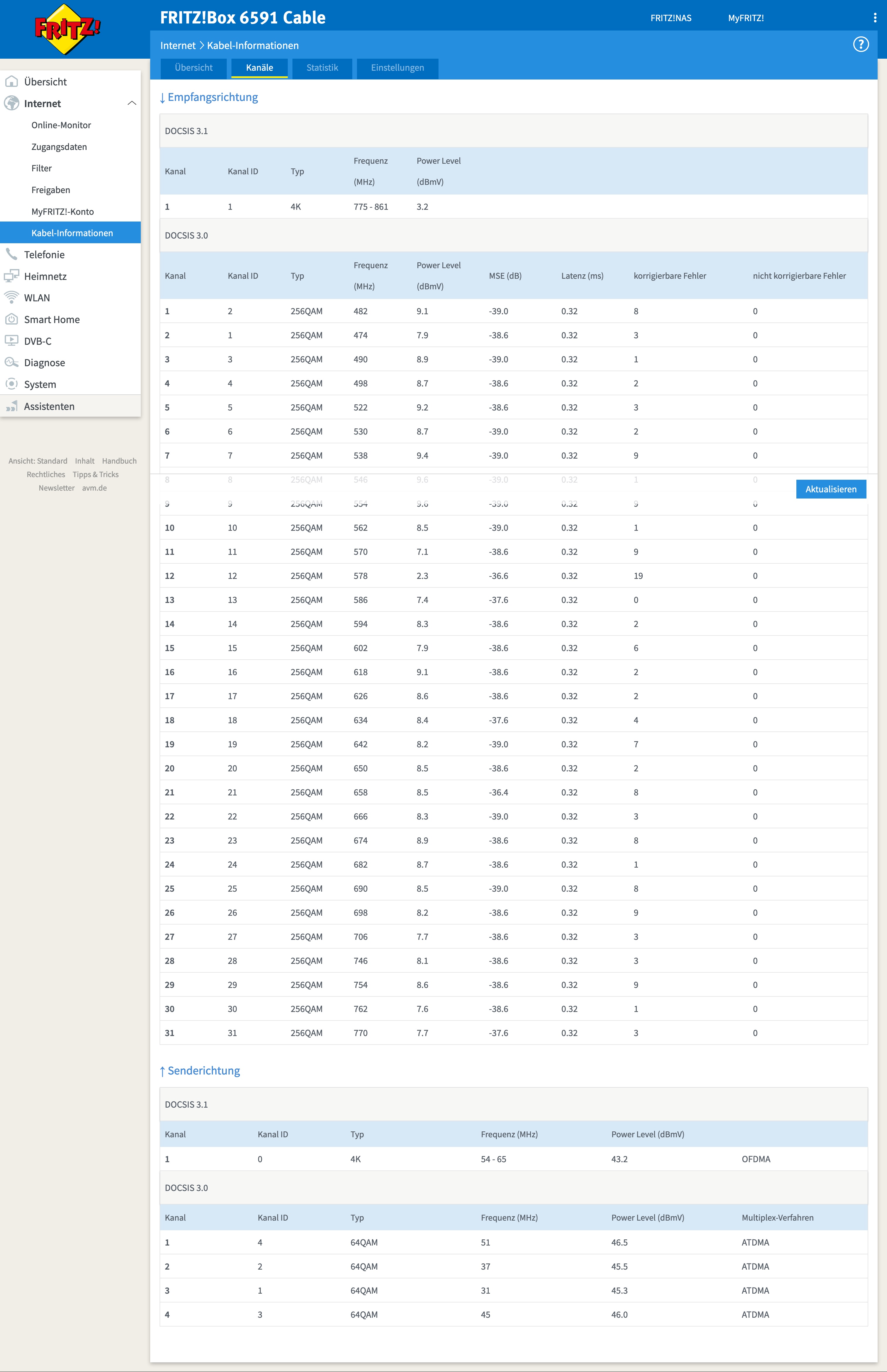 Kanäle sehen soweit alle korrekt aus, DOCSIS 3.1 ist ebenfalls aktiv.