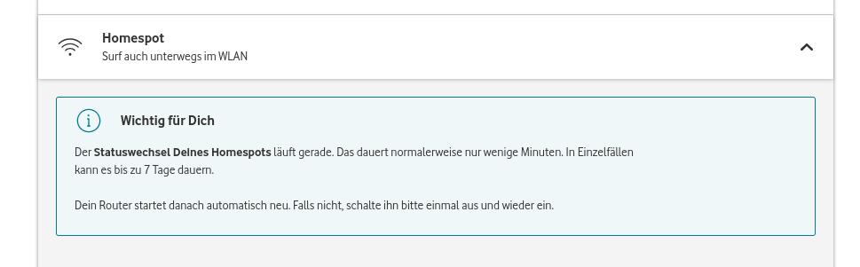 Es dauerte genau 7 Tage bis der Homespot im Kundencenter als aus angezeigt wurde. Bis heute. Heute konnte ich dann selbst den Bridgemode wieder einschalten. Im Kundencenter wird es nun nach anderthalb Wochen endlich richtig angezeigt: Homespot aus, Bridgemode an. Nach einem Neustart der Station und der Fritzbox bekam ich dann auch eine Router-IP zugeteilt und nicht mehr nur eine 192.168.0.X.
