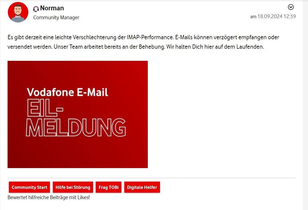 seit dem 15.09.2024 gibt es auch bei mir Verzögerungen im E-Mail-Eingang, seit zwei Tagen (?) erfolgt keinerlei Synchronisierung mit Outlook mehr. Der E-Mail-Ausgang scheint zu funktionieren, obwohl das auf "mail.vodafone.de" nicht gelistet wird.
