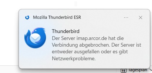 ich bekommen ständig die Meldung von Thunderbird: Verbindung zum Server IMAP.ARCOR.DE abgebrochen.