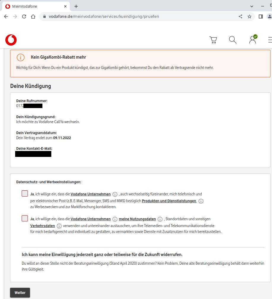 Ich möchte gerade einen Mobilfunkvertrag über das Webportal kündigen, allerdings funktioniert der letzte Schritt auf der Kündigungsseite, der Klick auf „Weiter“, nicht. Nach dem Klick auf den Butten passiert einfach nichts.