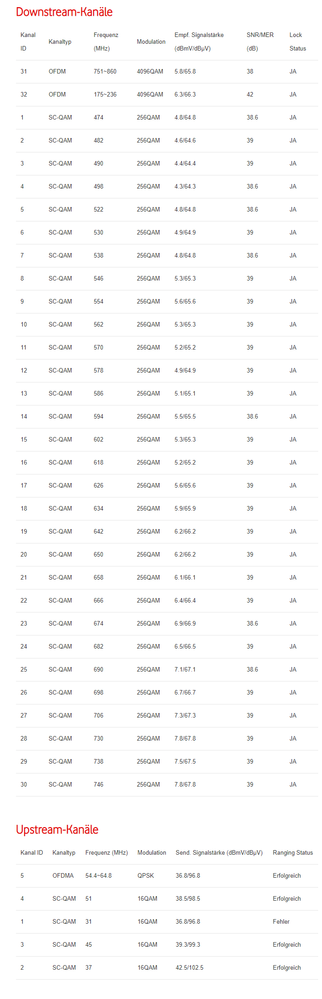 Lade dazu noch einen Screenshot von den Signalwerten hoch. Diese findest Du in der Benutzeroberfläche Deines Kabelrouters über 192.168.0.1 bzw. über 192.168.178.1 bei der Fritzbox