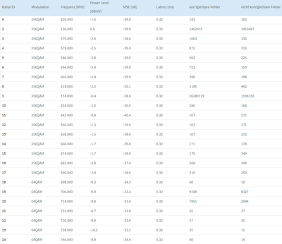 Um sich die Signalwerte anzeigen zu lassen, gehe zu Internet - Kabel Informationen -Kanäle