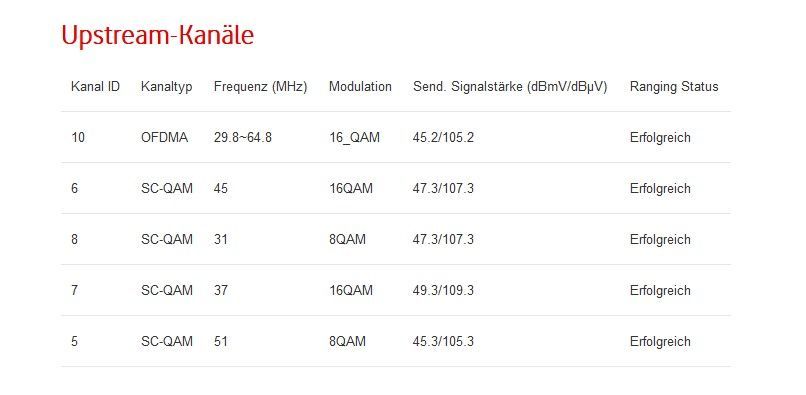 Vorher hatte ich immer 64QAM auf allen Uploadfrequenzen. Der Upload schwankt zwischen 25 und 45 MBit. Vorher konstant 54Mbit/s (also volle Leistung).