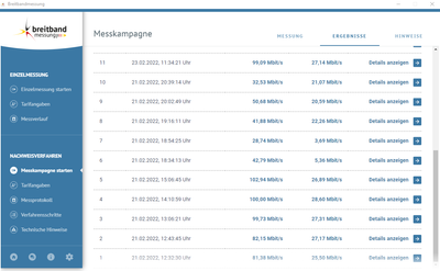 Dass es am Abend zu viel Last auf dem Netzt gibt, konnte ich schon vermuten, jedoch treten die Probleme auch zu jeder aneren Tageszeit auf. Schon ab den Mittagsstunden erreicht unsere Leitung nunoch maximal 30% der Maximalgeschwindigkeit. Dazu hänge ich Screenshots der Messkampagne an, welche ich über das Portal der Bundesnetzangentur momentan durchführe.