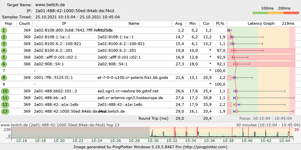 Ich habe leider nicht wirklich Ahung von diesem Ping Plotter ich habe das jetzt nur mal so laufen lassen xD ich war nicht am Streamen leidiglich habe ich die Adresse eingegeben und das unten kam dabei raus.