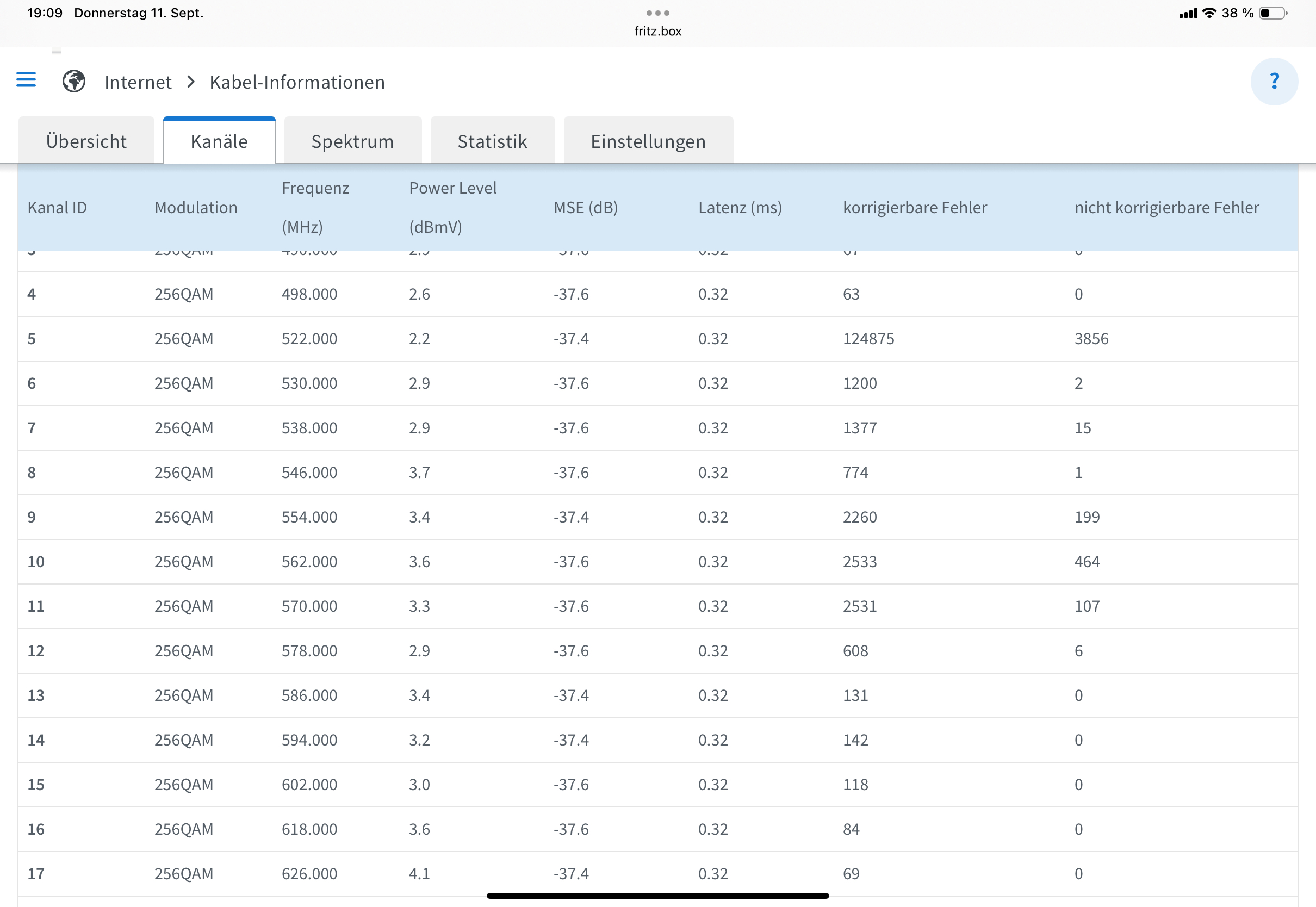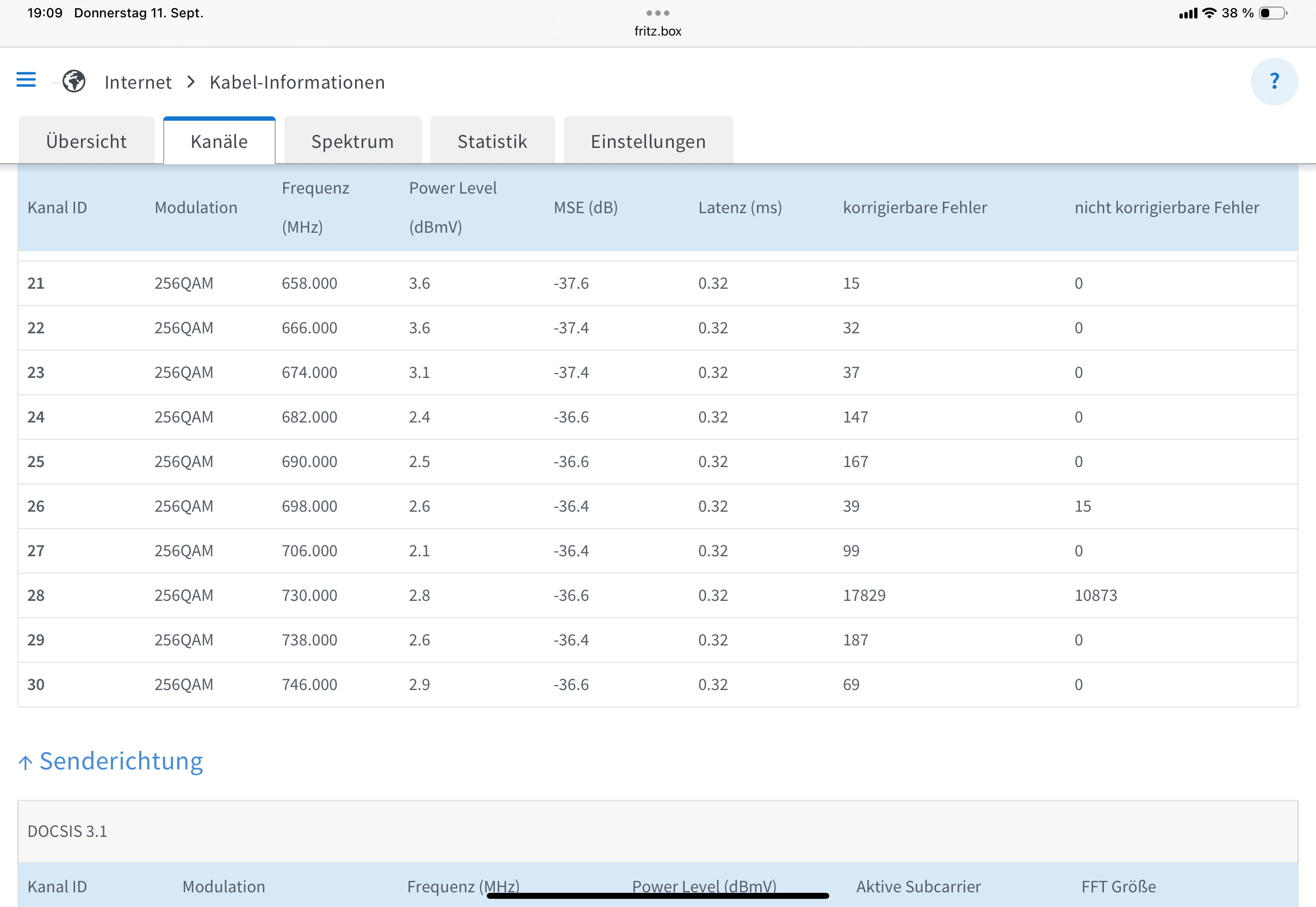 Parallel dazu zeigt meine Fritzbox Cable in diesem Frequenzbereich extrem viele nicht korrigierbare Fehler.
