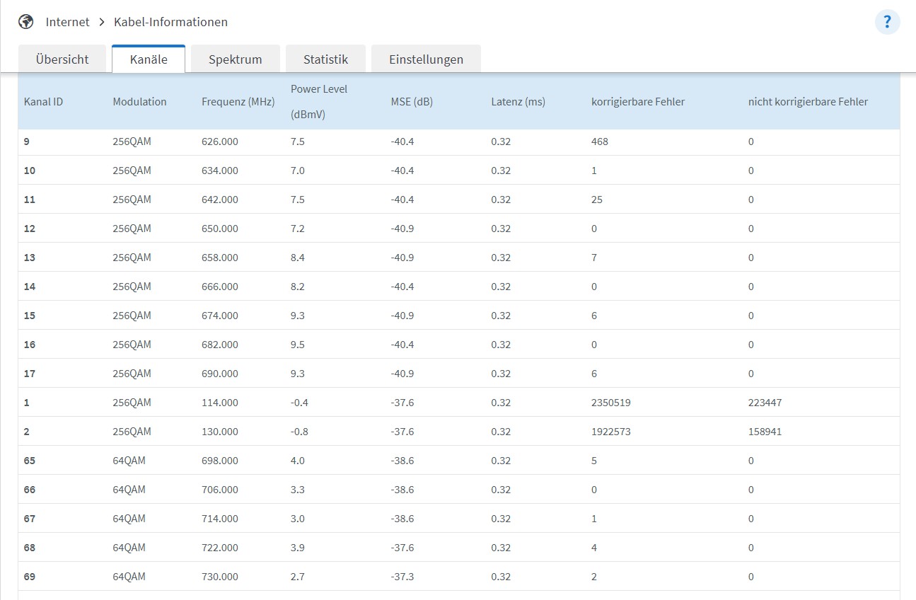 Hallo, ich hab einen Kabelanschluss mit ner Fritz!Box 6660 und einer 1Gbit Leitung. Ich Kämpfe jetzt seit Wochen mit Verbindungsabbrüchen und einer grottig langsamen Leitung. Ein Ticket hatte ich bereits aufgegeben und ein Techniker wollte sich das anschauen. Der Termin wurde aber dann seitens der Technikerfirma gecancelt, da wohl Vodafone die falsche Hausnummer weitergegeben hat. Statt dessen wurde mir dann ein neuer Router zu geschickt und was soll ich sagen? Richtig, keine Änderung. Die Auswirkungen sind so stark, das ich teilweise mein IP TV nicht nutzen kann, meine Alexa nicht mehr mit mir redet oder ich keine Videos in Youtube oder sozialen Netzwerken anschauen kann. Ich habe in der Fritz!Box unter Kabelinformationen/Kanäle Einträge zu "nicht korrigierbare Fehler" gefunden. Kann das ein Hinweis auf meine Probleme sein? Wie mach ich hier am besten weiter?