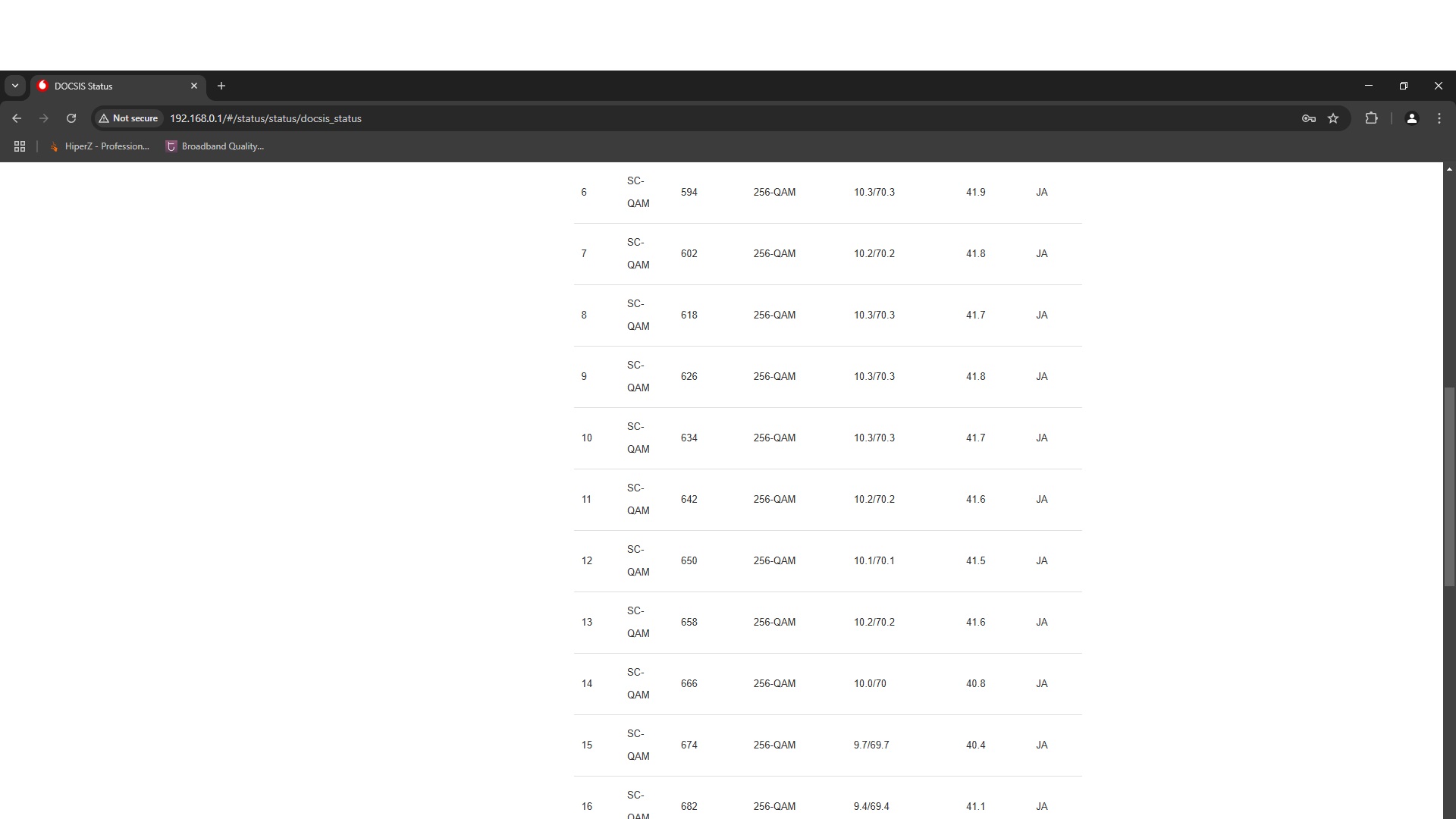 Danach links den Menüpunkt Docsis-Status öffnen, dort werden die Signalwerte angezeigt.