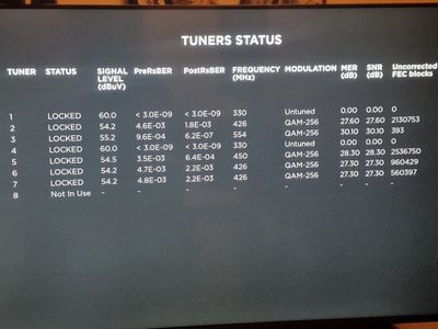 der Signalpegel ist auf allen Kanälen im grünen Bereich, aber alle Kanäle sind sehr stark gestört oder es liegt auf 330 MHz kein DVB-C Signal an. Auf den anderen Frequenzen sind der MER und der SNR Wert für die Signalqualität zu niedrig. Die Bit Fehler Rate BER ist viel zu hoch und es gibt auch viele nicht korrigierbare Fehler auf den Kanälen.