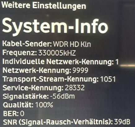 hat der Techniker den Signalpegel direkt an der Box gemessen, oder nur am Übergabepunkt? Auf der GigaTV Box sollte es auch Seiten bei den Einstellungen geben, auf der die Systemwerte der Box angezeigt werden. Dort könnte es auch eine Seite "TUNER" geben, auf der die Signalpegel und mehr von den aktiven Tunern angezeigt werden. Wenn Du eine solche Seite findest, dann mache bitte ein Bild davon.